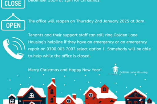 Golden Lane Housing’s office will close on Tuesday 24th December 2024 at 1pm for Christmas.